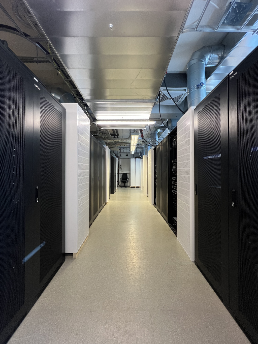 Cooling is a cold aisle solution. We have cold air delivered via air ducts to displacement units which supply cooling with low velocity within cold aisle.